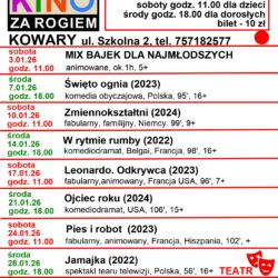 KINO ZA ROGIEM – KOWARY STYCZEŃ 2026 MOK Kowary, ul. Szkolna 2 757 182 577 Bilet: 10 zł Seanse: • soboty godz. 11:00 – dla dzieci • środy godz. 18:00 – dla dorosłych REPERTUAR: Sobota | 3.01.2026 | godz. 11:00 Mix bajek dla najmłodszych animowane, ok. 1 h, 5+ Środa | 7.01.2026 | godz. 18:00 Święto ognia (2023) komedia obyczajowa, Czytaj więcej Styczeń w naszym Kinie za Rogiem – zapraszamy[…]