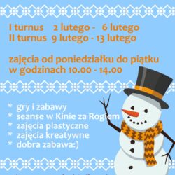 Zapraszamy dzieci w wieku lat 6 – 12 do udziału w naszych feryjnych zajęciach. I turnus (2-6 lutego) II turnus (9-13 lutego) Do pobrania regulamin i oświadczenie ==>>>> POBIERZ