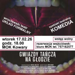 Teatr Układ Formalny zaprasza na patokomedię Michała Walczaka „Gwiazdy tańczą na głodzie”. Wejściówki można rezerwować i odbierać od środy w biurze MOK. Zapraszamy. Jest to satyra na showbiznes, ale także czarna komedia o głodzie miłości, atencji i lajków, który prowadzi do zbrodni. Jeśli w życiu brakuje ci wrażeń, zwykłe spektakle, seriale i talent show cię Czytaj więcej Gwiazdy tańczą na głodzie – zapraszamy na spektakl 17 lutego, godz. 18.00[…]