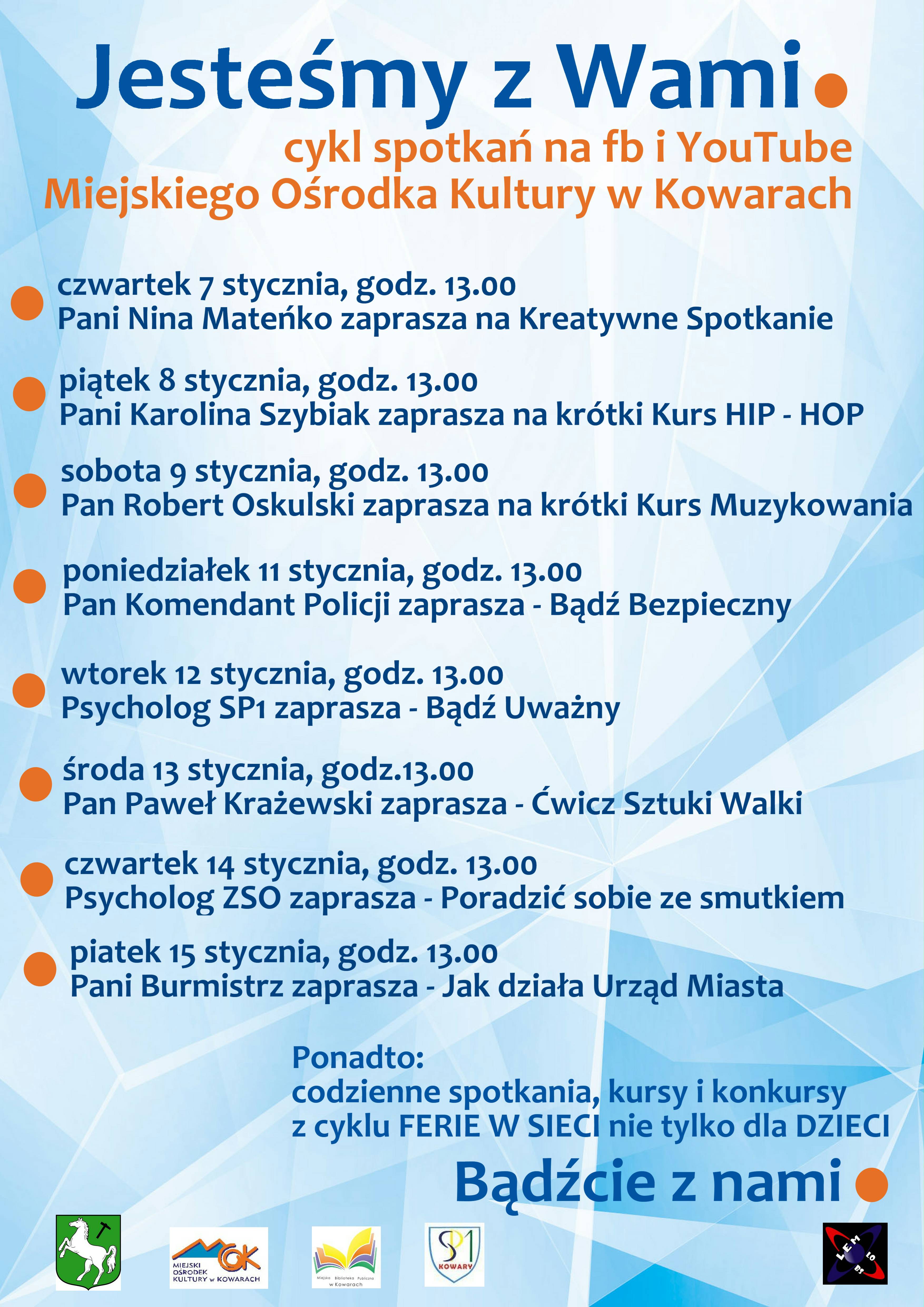 Jesteśmy z Wami – ferie z kulturą Data publikacji 7 stycznia 2021 by Maciej Janas Dzisiaj rozpoczynamy nasz cykl spotkań.”Jesteśmy z Wami” Zapraszamy na naszego FB codziennie o godz. 13.00.