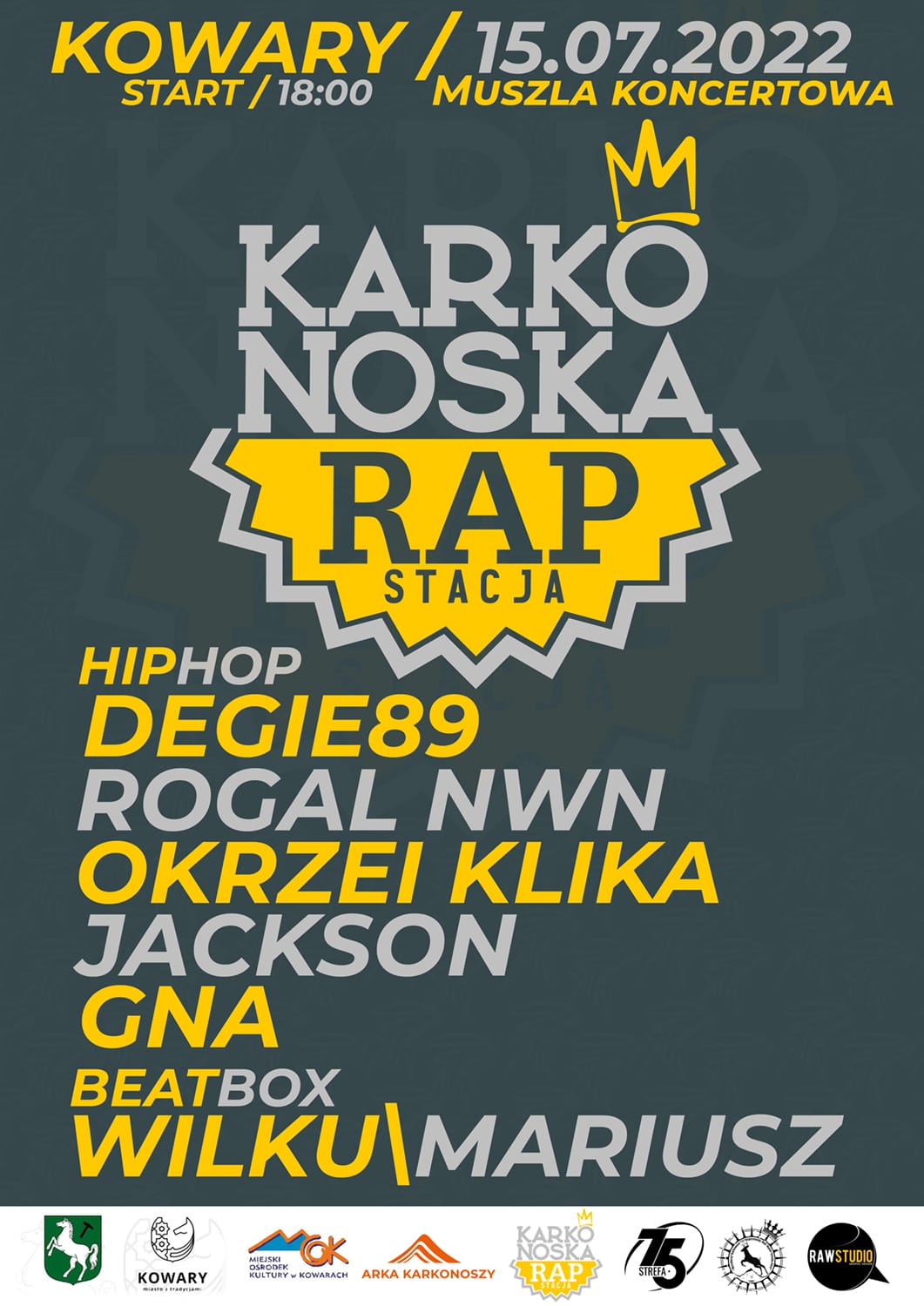 Już 15 lipca 2022 Karkonoska Rap Stacja zaprasza na hip-hopowe wydarzenie. Od godziny 18:00 w kowarskiej muszli koncertowej zagrają dla Was: