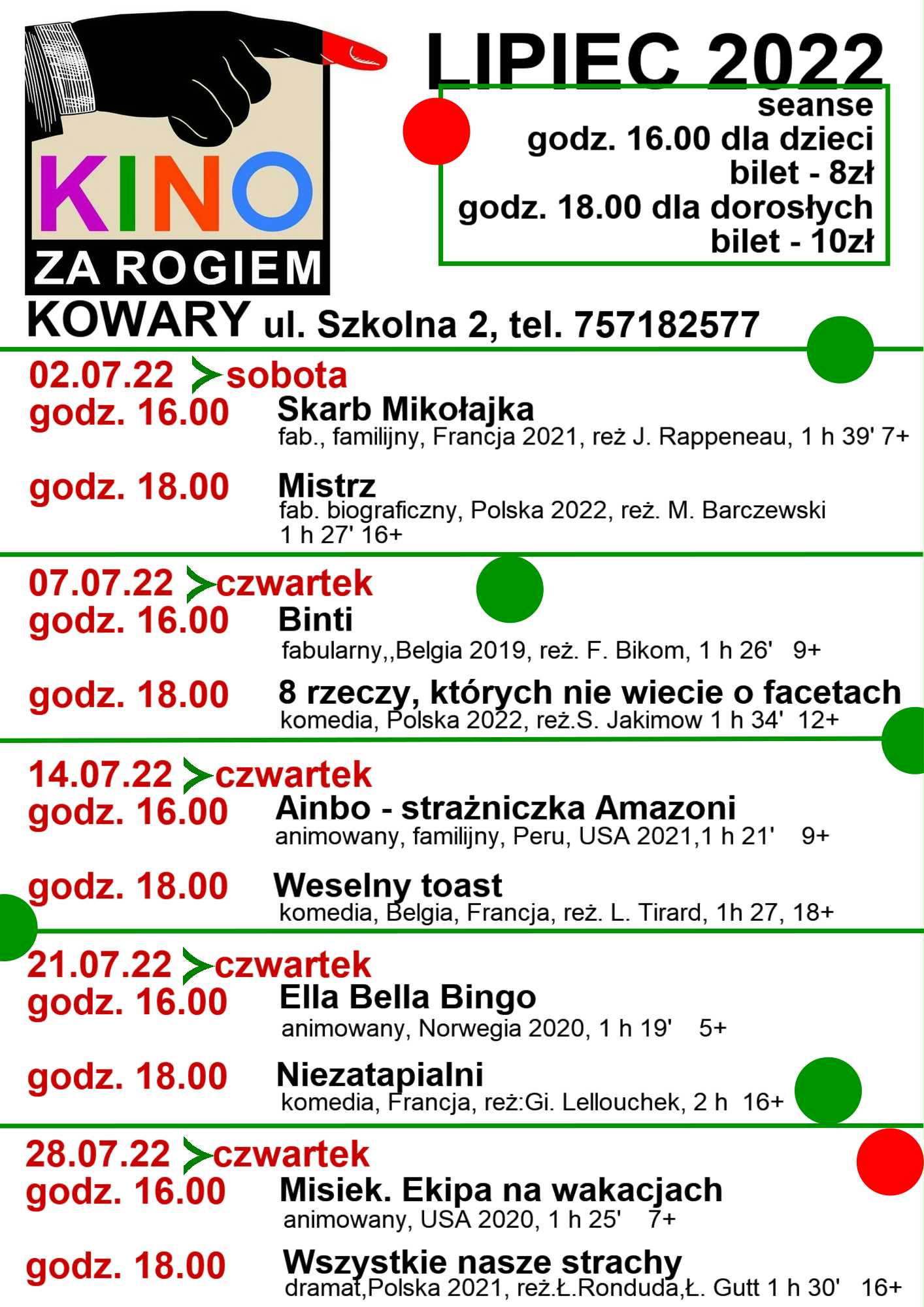 Kino za Rogiem w lipcu – zmiany dni seansów Data publikacji 30 czerwca 2022 by Maciej Janas ZApraszamy w wakacje do naszego Kina za Rogiem. Gramy w pierwszą sobotę lipca a potem w każdy czwartek. Seanse dla dzieci o godz. 16.00 i dla dorosłych o 18.00. Zapraszamy.