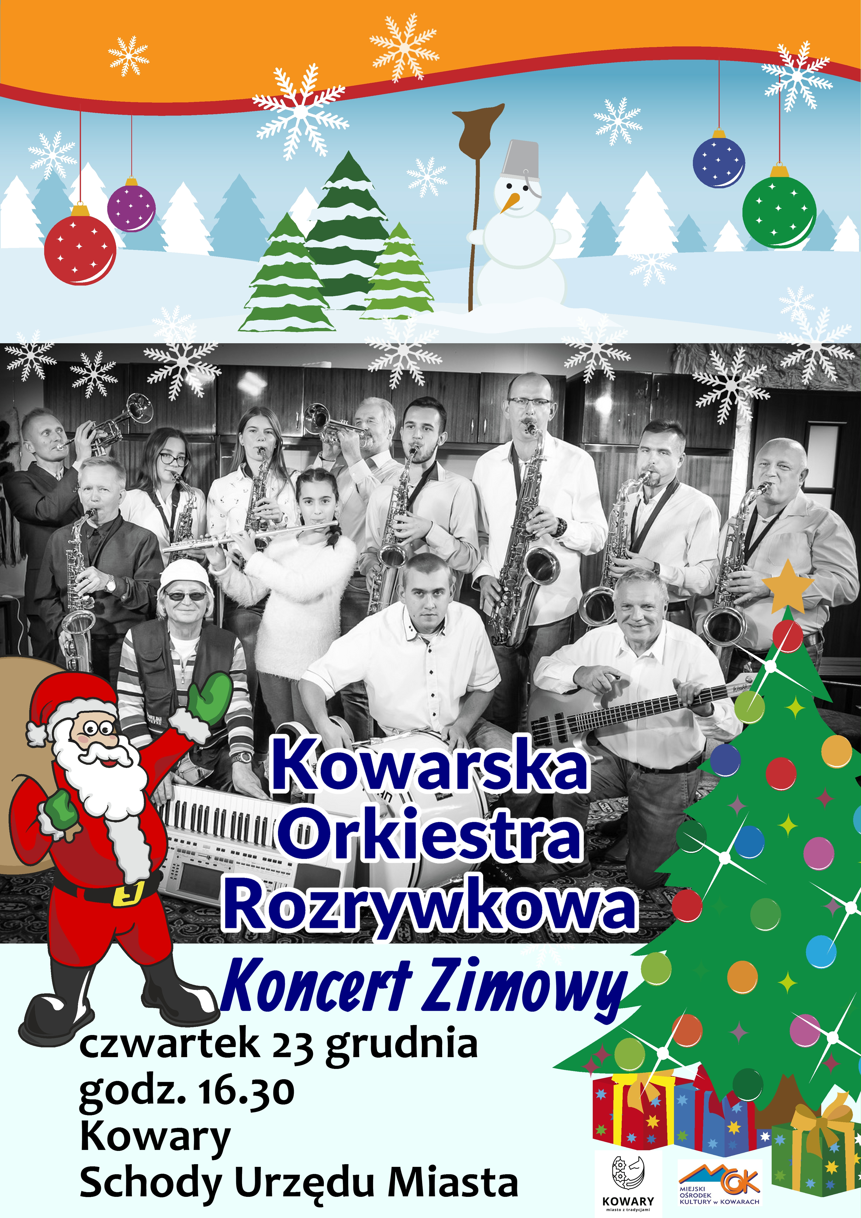 Koncert zimowy Kowarskiej Orkiestry Rozrywkowej Data publikacji 21 grudnia 2021 by Maciej Janas Zapraszamy w czwartek, 23 grudnia o godz. 16.30 pod kowarski ratusz na koncert Kowarskiej Orkiestry Rozrywkowej.