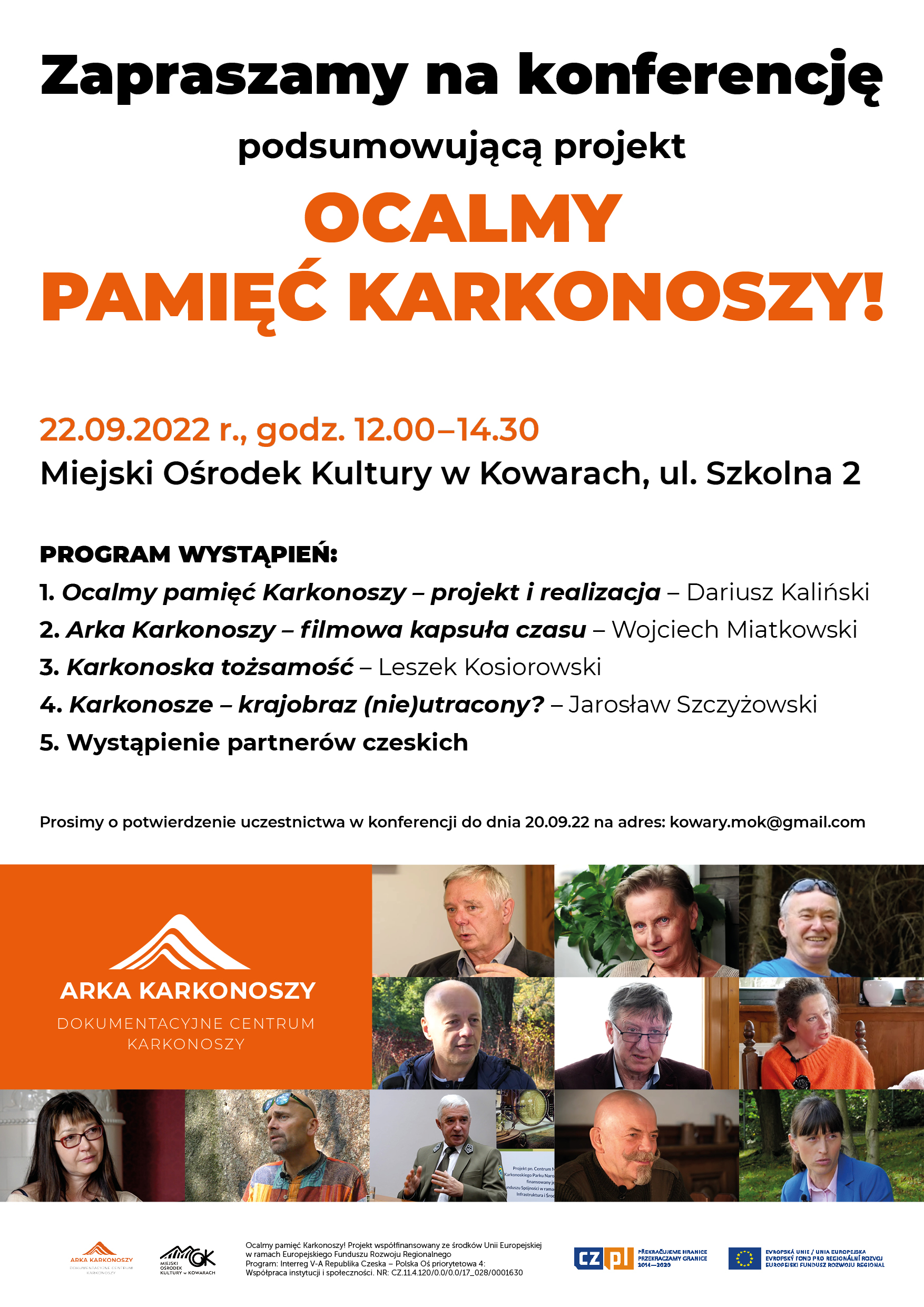 Zapraszamy na konferencję podsumowująca nasz projekt „Ocalmy pamięć Karkonoszy!” 22 września 2022 spotykamy się w sali MOK, Kowary ul. Szkolna 2 o godz. 12.00. Wstęp wolny, prosimy o potwierdzenie obecności do 22.09.22.