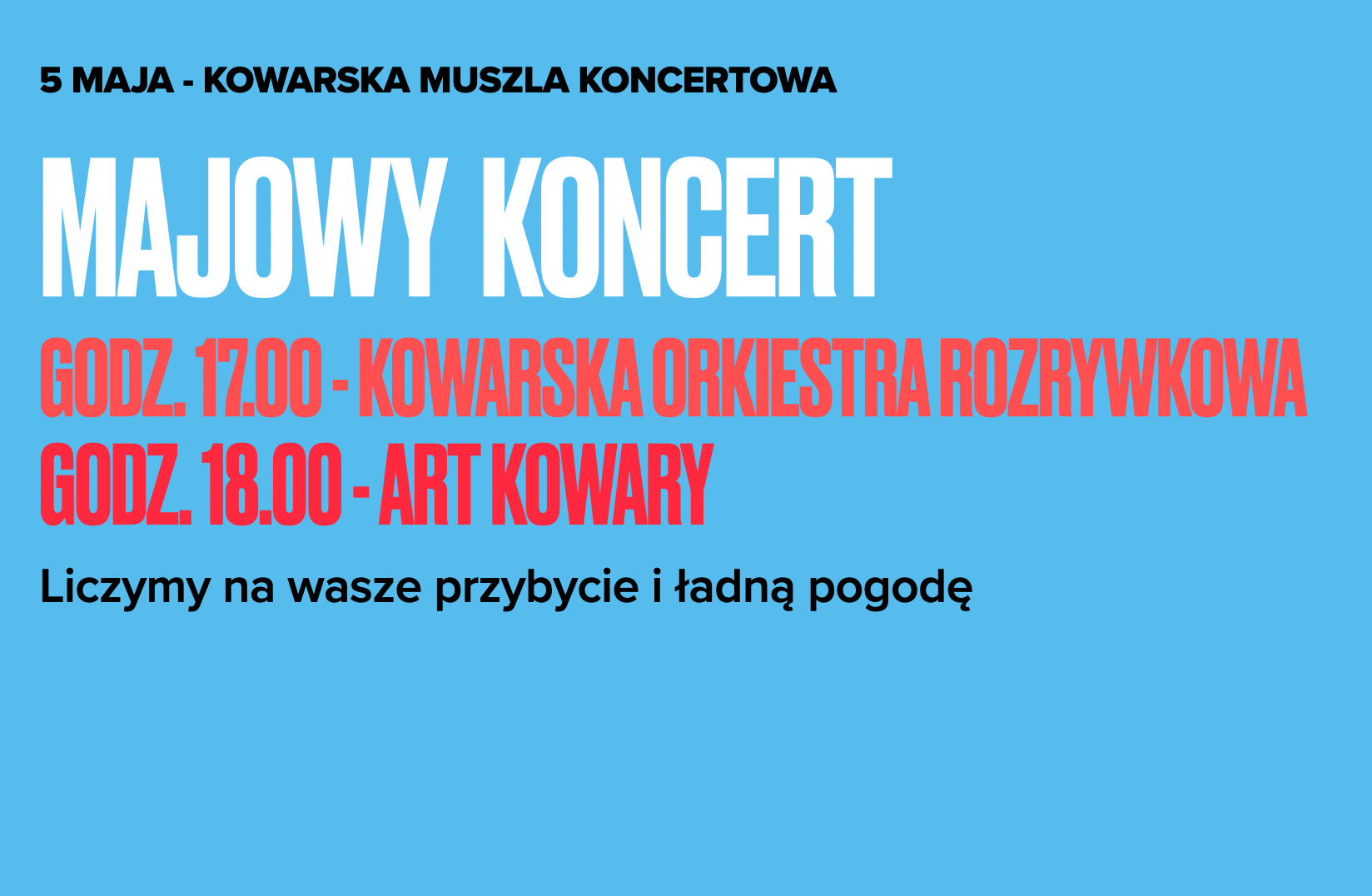 Zapraszamy w piątek 5 maja na koncert Kowarska Orkiestra Rozrywkowa o godz. 17.00 do kowarskiej muszli koncertowej. Po nich o godz. 18.00 wystąpi zespół ART KOWARY.