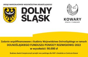 Informujemy, że Gmina Miejska Kowary otrzymała dotację celową w wysokości 90.000 zł z Budżetu Województwa Dolnośląskiego w ramach DOLNOŚLĄSKIEGO FUNDUSZU POMOCY ROZWOJOWEJ 2022 na zadanie pn. „Budowa dwóch bezpiecznych przejść oraz parkingu dla NSP i chodnika w Centrum Kowar”.