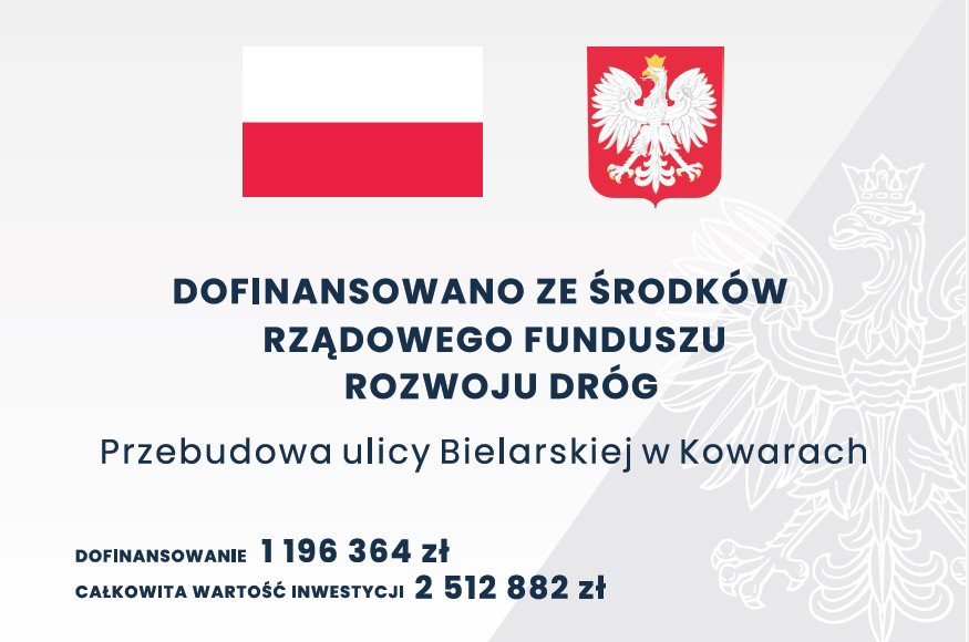Uprzejmie informujemy, że Gmina Miejska Kowary otrzymała dofinansowanie ze środków pochodzących z Rządowego Funduszu Rozwoju Dróg na realizację projektu pn.: „Przebudowa ulicy Bielarskiej w Kowarach”.
