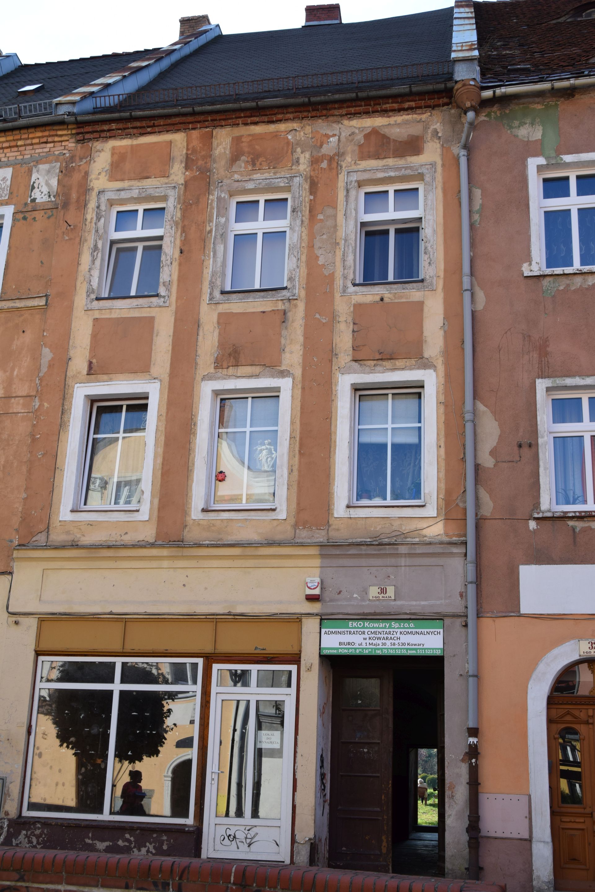 Przy ul. 1 Maja 30 przeprowadzono remont elewacji budynku. W ramach zadania zrealizowano prace termomodernizacyjne: renowację stolarki okiennej i drzwiowej. Zarządca – Zarząd Eksploatacji Zasobów Komunalnych, ul. Dworcowa 11, 58-530 Kowary.