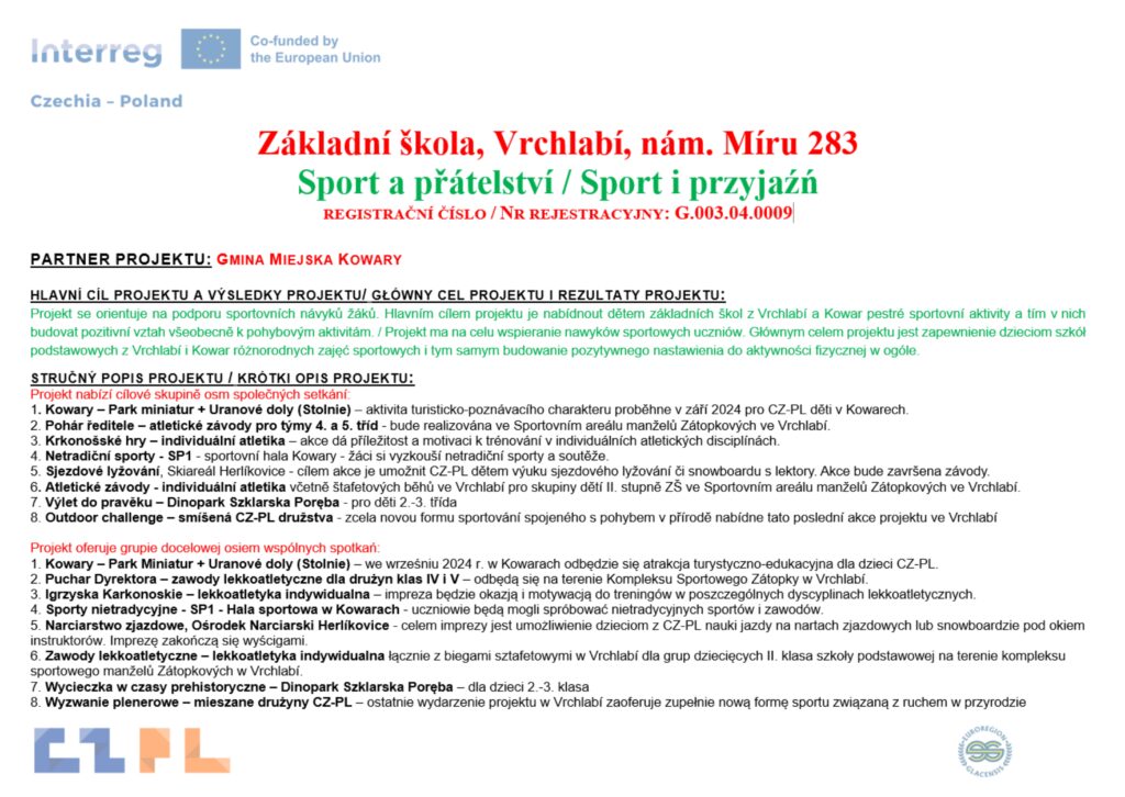PL: Projekt ma na celu wspieranie nawyków sportowych uczniów. Głównym celem projektu jest zapewnienie dzieciom szkół podstawowych z Vrchlabí i Kowar różnorodnych zajęć sportowych i tym samym budowanie pozytywnego nastawienia do aktywności fizycznej w ogóle.
