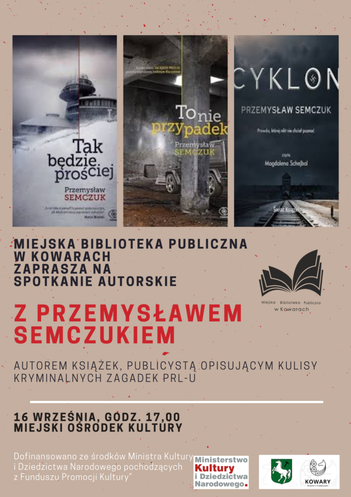 Miejska Biblioteka Publiczna w Kowarach zaprasza na spotkanie autorskie z Przemysławem Semczukiem autorem książek, publicystą opisującym kulisy kryminalnych zagadek PRL-u.
