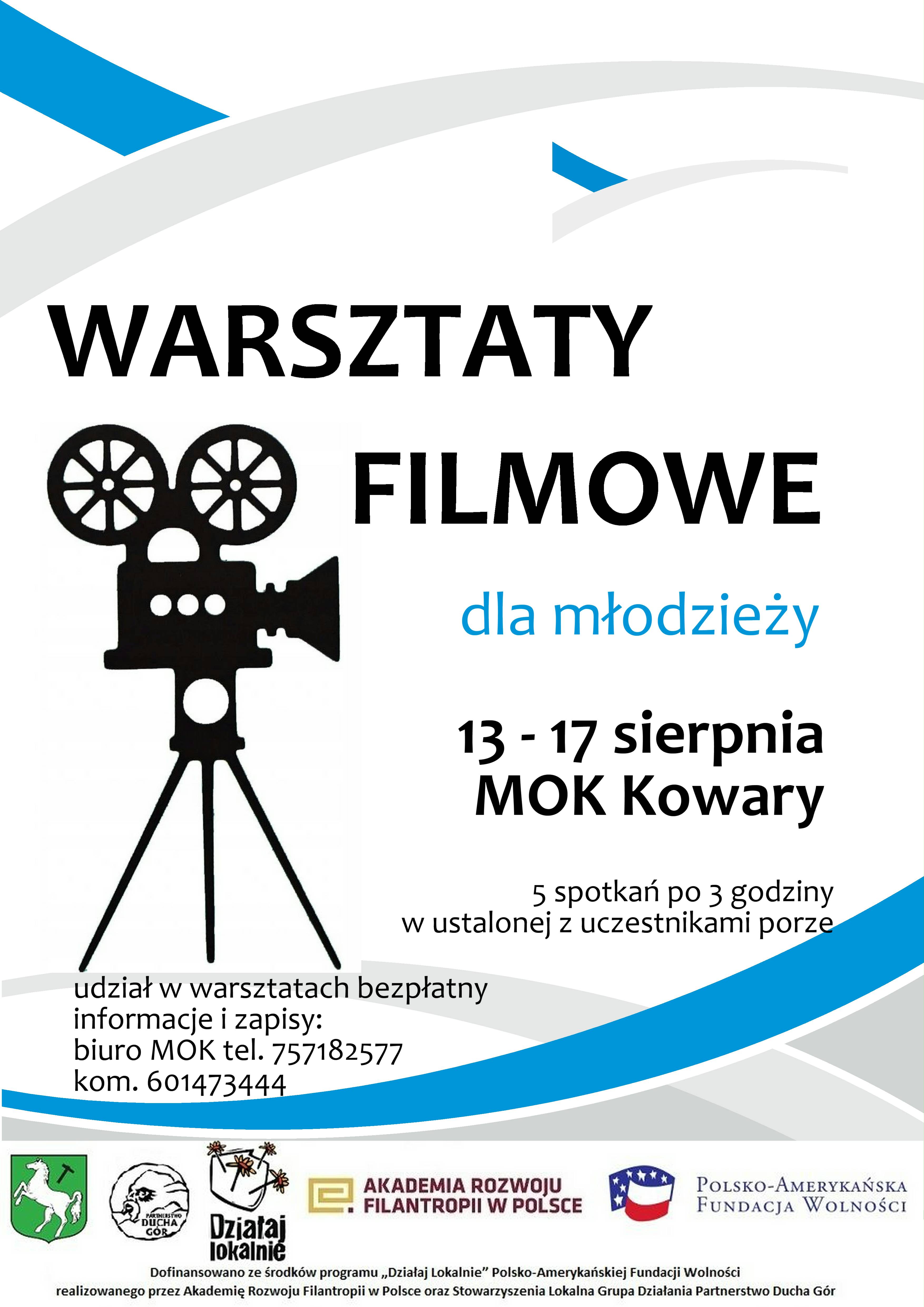 Warsztaty filmowe dla młodzieży Data publikacji 10 sierpnia 2021 by Maciej Janas Zapraszamy chętnych do udziału w warsztatach filmowych w terminie 12 – 17 sierpnia. Odbędzie się pięć trzygodzinnych spotkań. Warsztaty dla młodzieży w wieku 12 – 18 lat. W programie podstawy filmowania. Więcej informacji tel. 601 473 444