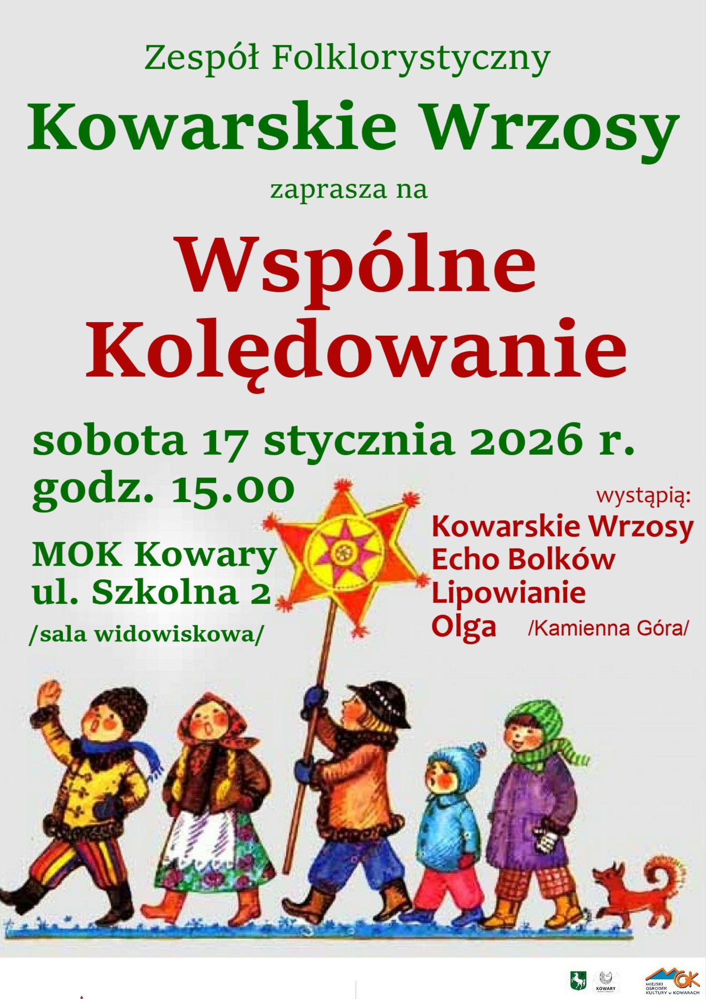Wspólne Kolędowanie w MOK Data publikacji 7 stycznia 2026 by Maciej Janas sobota, 17 stycznia 2026 r., godz. 15.00 MOK Kowar, ul. Szkolna 2, sala widowiskowa/ Wystąpią: Kowarskie Wrzosy Echo Bolków Lipowianie Olga (Kamienna Góra)