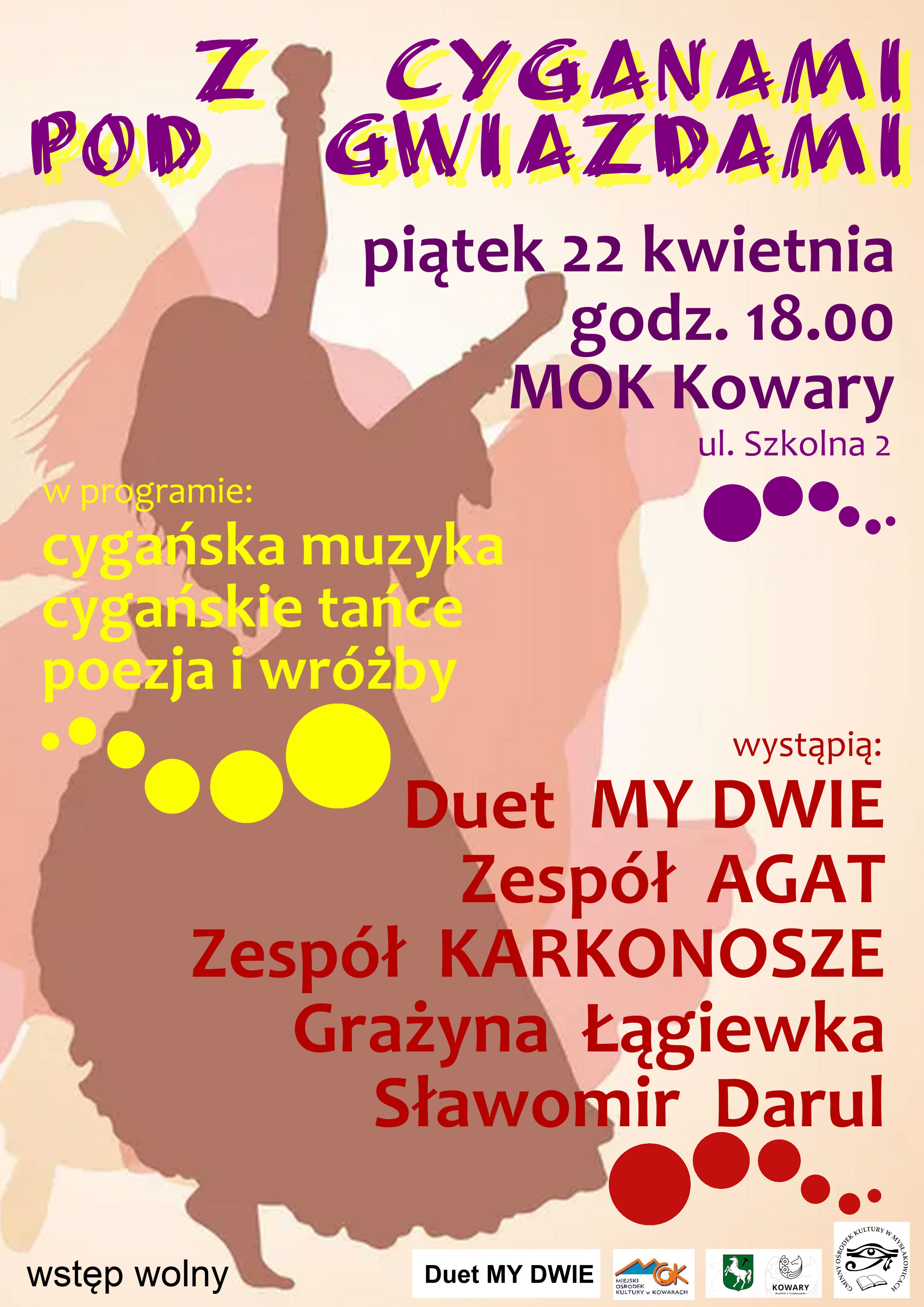 Z Cyganami pod gwiazdami – koncert na sali widowiskowej MOK Data publikacji 14 kwietnia 2022 by Maciej Janas Zapraszamy 22 kwietnia 2022 na koncert „Z Cyganami pod gwiazdami”. Wystąpi duet My dwie w towarzystwie zespołów Karkonosze i Agat. Godz. 18.00 sala widowiskowa MOK w Kowarach. Wstęp wolny.